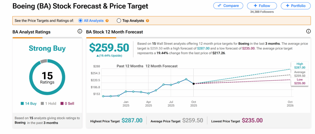On the other hand, Boeing’s shares currently have a Strong Buy consensus recommendation from Wall Street. This is based on 14 Buys and one Hold issued by analysts over the past three months. Furthermore, at $259.50, the average BA price target indicates more than 19% upswing potential from the current level.