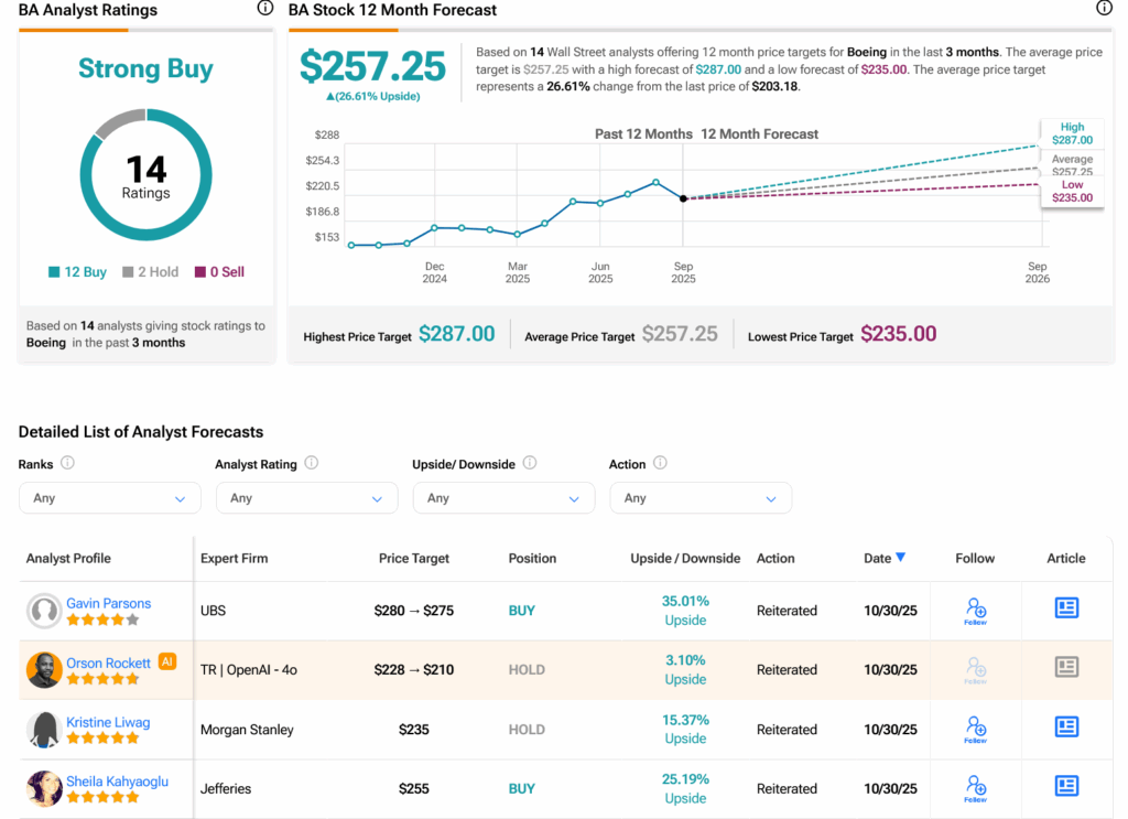 Turning to Wall Street, analysts have a Strong Buy consensus rating on BA stock based on 12 Buys and two Holds assigned in the past three months, as indicated by the graphic below. After a 43.04% rally in its share price over the past year, the average BA price target of $257.25 per share implies 26.61% upside potential.