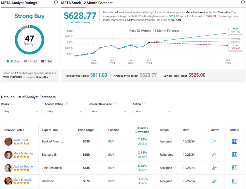 Turning to Wall Street, analysts have a Strong Buy consensus rating on META stock based on 42 Buys, four Holds, and one sell assigned in the past three months, as indicated by the graphic below. After a 95% rally in its share price over the past year, the average META price target of $628.77 per share implies 7% upside potential.