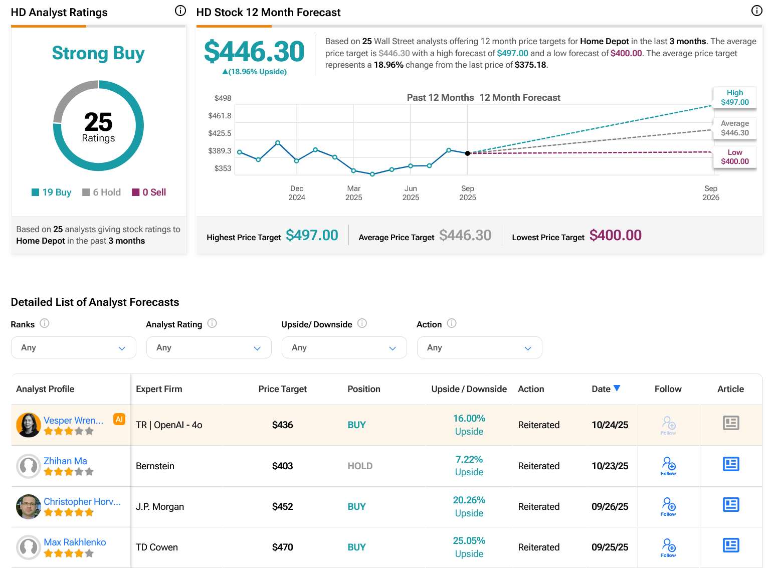 Turning to Wall Street, analysts have a Strong Buy consensus rating on HD stock based on 19 Buys and six Holds assigned in the past three months, as indicated by the graphic below. After a 4.04% loss in its share price over the past year, the average HD price target of $446.30 per share implies 18.96% upside potential.
