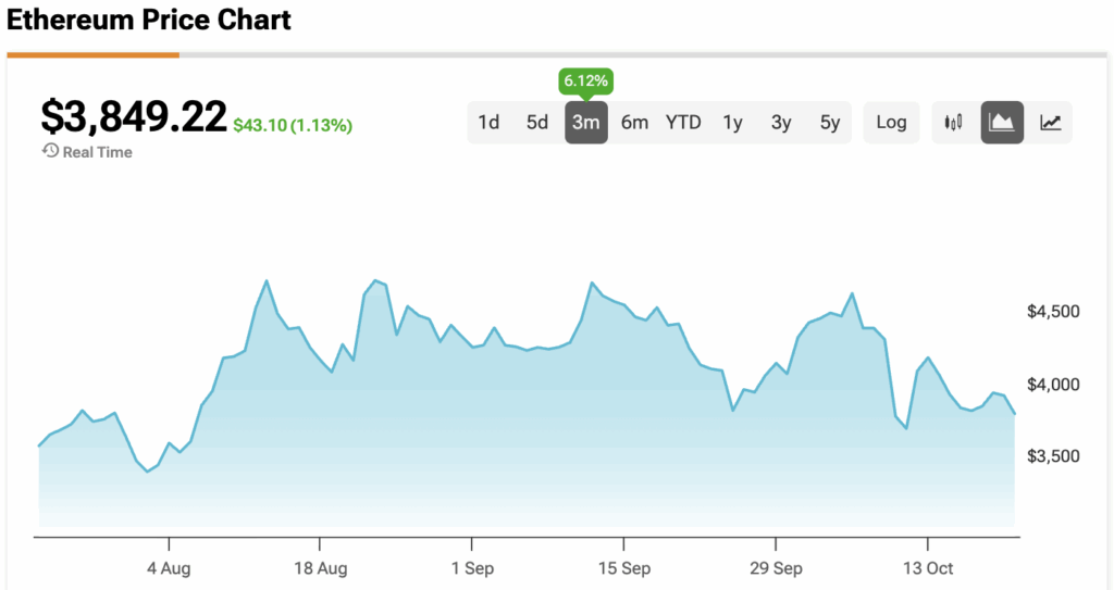 At the time of writing, Ethereum is sitting at $3,849.22.
