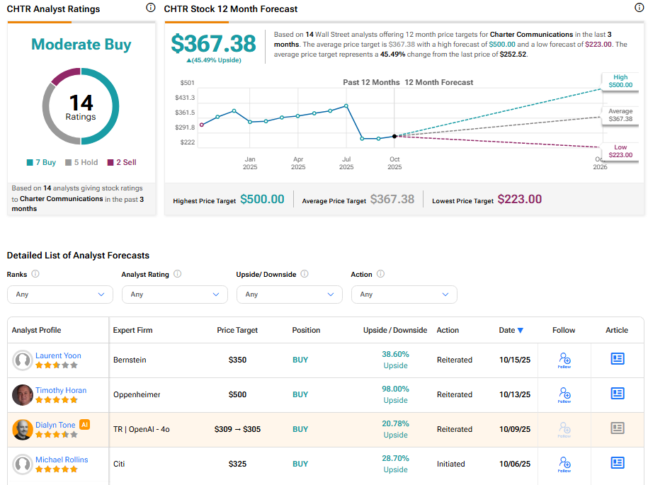 Turning to Wall Street, analysts have a Moderate Buy consensus rating on Charter Communications stock based on seven Buys, five Holds, and two Sells assigned in the past three months, as indicated by the graphic below. After a 23.4% loss in its share price over the past year, the average CHTR price target of $367.38 per share implies 45.49% upside potential.