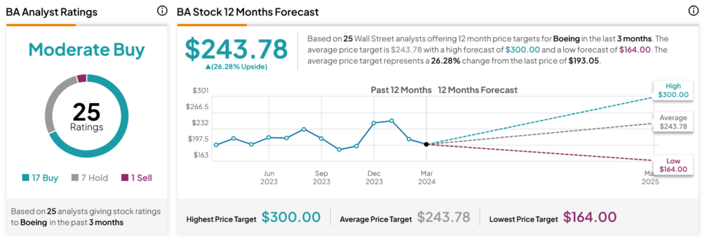 Turning to Wall Street, analysts have a Moderate Buy consensus rating on BA stock based on 17 Buys, seven Holds, and one Sell assigned in the past three months, as indicated by the graphic below. After a 7.32% loss in its share price over the past year, the average BA price target of $243.78 per share implies 26.28% upside potential.