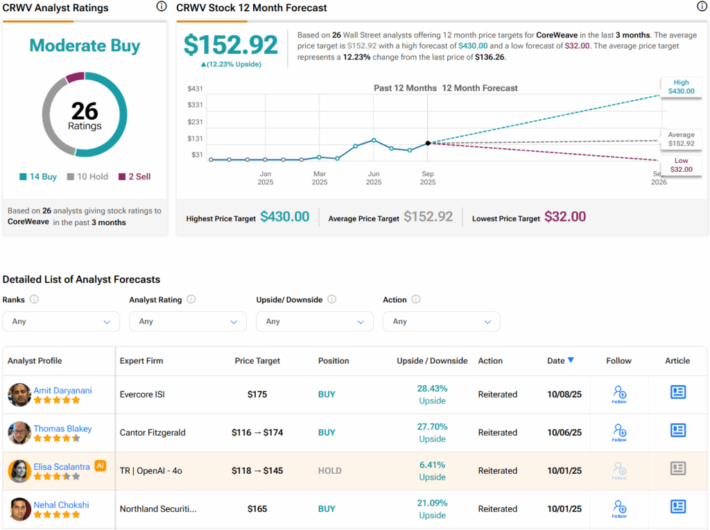Turning to Wall Street, analysts have a Moderate Buy consensus rating on CRWV stock based on 14 Buys, 10 Holds, and two Sells assigned in the past three months, as indicated by the graphic below. Furthermore, the average CRWV price target of $152.92 per share implies 12.2% upside potential.
