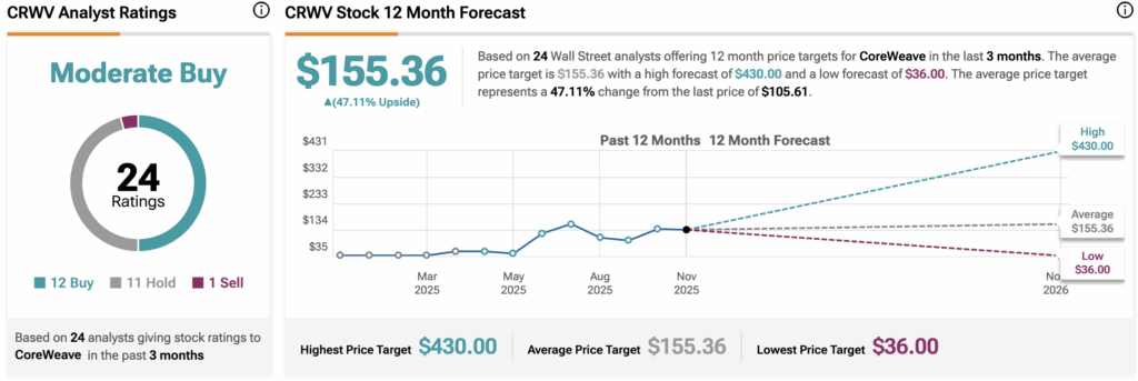 The stock of CoreWeave has a consensus Moderate Buy rating among 24 Wall Street analysts. That rating is based on 12 Buy, 11 Hold, and one Sell recommendation assigned in the last three months. The average CRWV price target of $155.36 implies 47.11% upside from current levels.