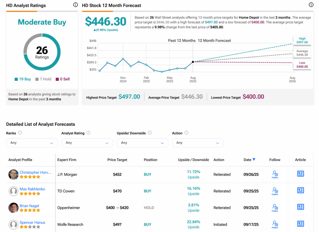 Turning to Wall Street, analysts have a Moderate Buy consensus rating on HD stock based on 19 Buys and seven Holds assigned in the past three months, as indicated by the graphic below. After a 0.55% loss in its share price over the past year, the average HD price target of $446.30 per share implies 9.98% upside potential.