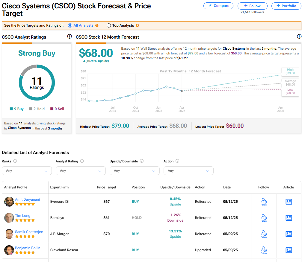 The stock of Cisco Systems has a consensus Strong Buy rating among 11 Wall Street analysts. That rating is based on nine Buy and two Hold recommendations issued in the last three months. The average CSCO price target of $68 implies 10.98% upside from current levels. These ratings are likely to change after the company’s financial results.