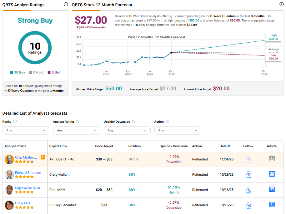 D-Wave continues to enjoy the Street’s analysts’ backing with a Strong Buy consensus rating. The average QBTS stock price target stands at $27, implying an 18.40% downside from the current price.