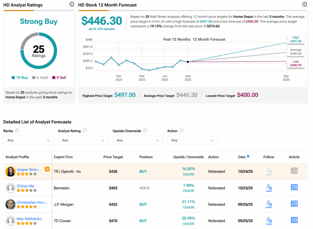 Turning to Wall Street, analysts have a Strong Buy consensus rating on HD stock based on 19 Buys and six Holds assigned in the past three months, as indicated by the graphic below. After a 1.36% loss in its share price over the past year, the average HD price target of $446.30 per share implies 19.13% upside potential.