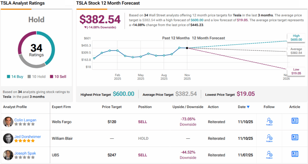 9 other analysts join Dorsheimer on the TSLA sidelines, while an additional 14 Buys and 10 Sells all add up to a Hold (i.e., Neutral) consensus rating. The forecast calls for a 12-month loss of 14%, considering the average price target stands at $382.54. (See TSLA stock forecast)