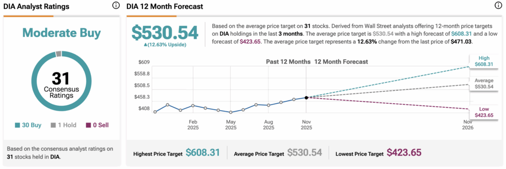 Wall Street believes that DIA stock has room to rise. During the past three months, analysts have issued an average DIA price target of $530.54, implying upside of 12.63% from current prices. The 31 holdings in DIA carry 30 buy ratings, one hold rating, and zero sell ratings.