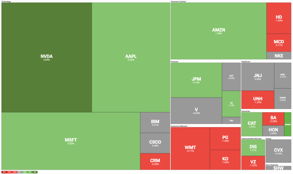 Let’s pivot to TipRanks’ Dow Jones Heatmap, which illustrates the stocks that have contributed to the index’s price action.