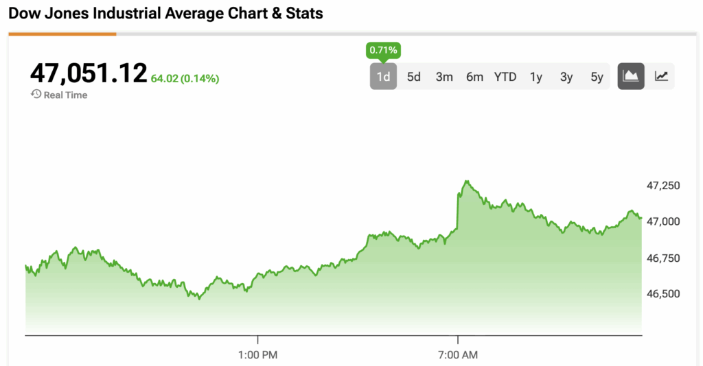 The Dow Jones (DJIA) is trading higher but has given up most of its early morning gains on the 41st day of the government shutdown.