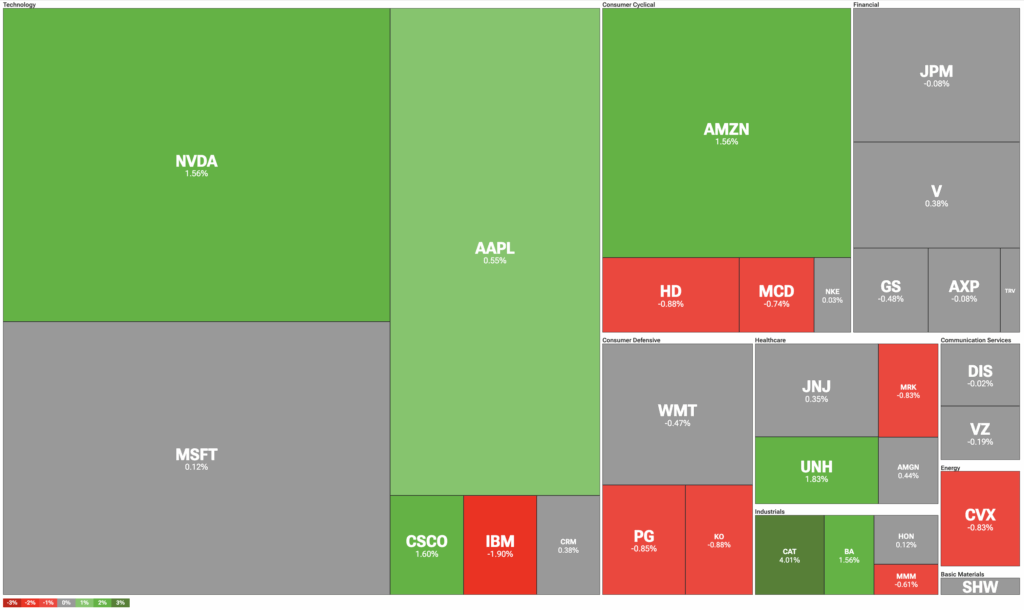 Let’s pivot to TipRanks’ Dow Jones Heatmap, which illustrates the stocks that have contributed to the index’s price action.