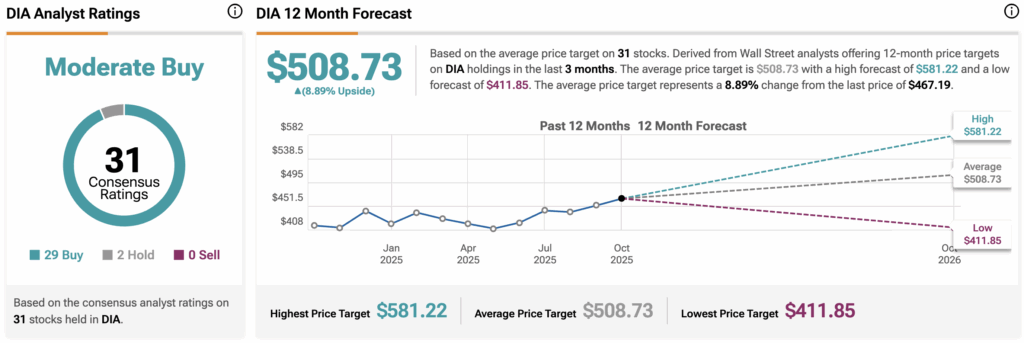 Wall Street believes that DIA stock has room to rise. During the past three months, analysts have issued an average DIA price target of $508.73, implying upside of 8.89% from current prices. The 31 holdings in DIA carry 29 buy ratings, two hold ratings, and zero sell ratings.