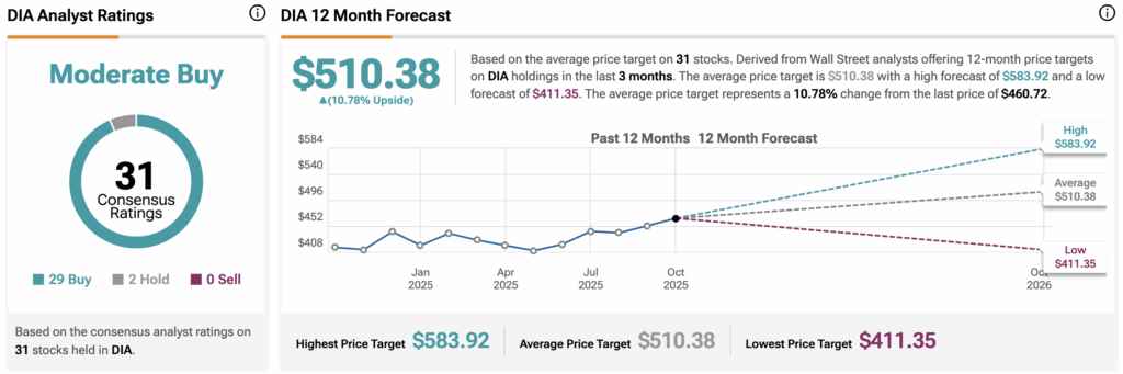 Wall Street believes that DIA stock has room to rise. During the past three months, analysts have issued an average DIA price target of $510.83, implying upside of 10.78% from current prices. The 31 holdings in DIA carry 29 buy ratings, two hold ratings, and zero sell ratings.