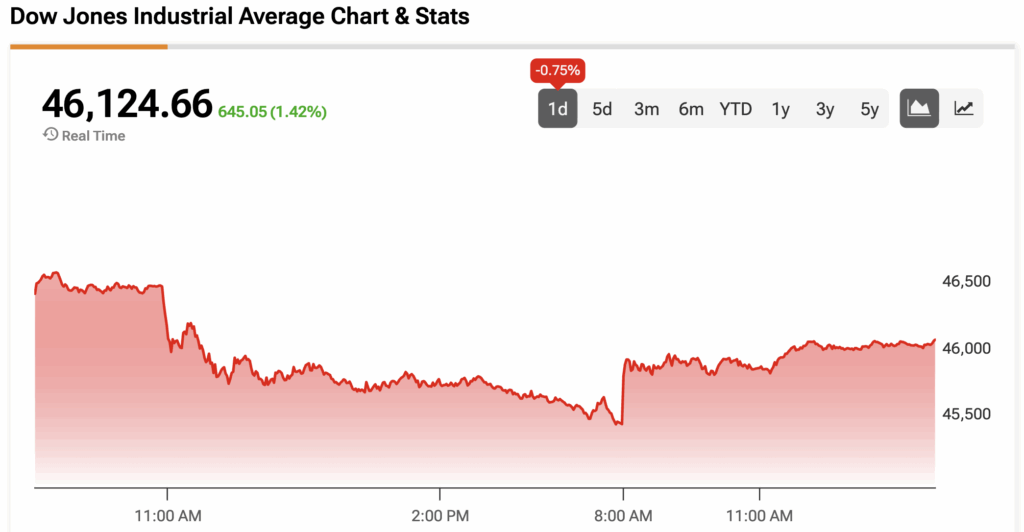 The Dow Jones is up by 1.42% at the time of writing.