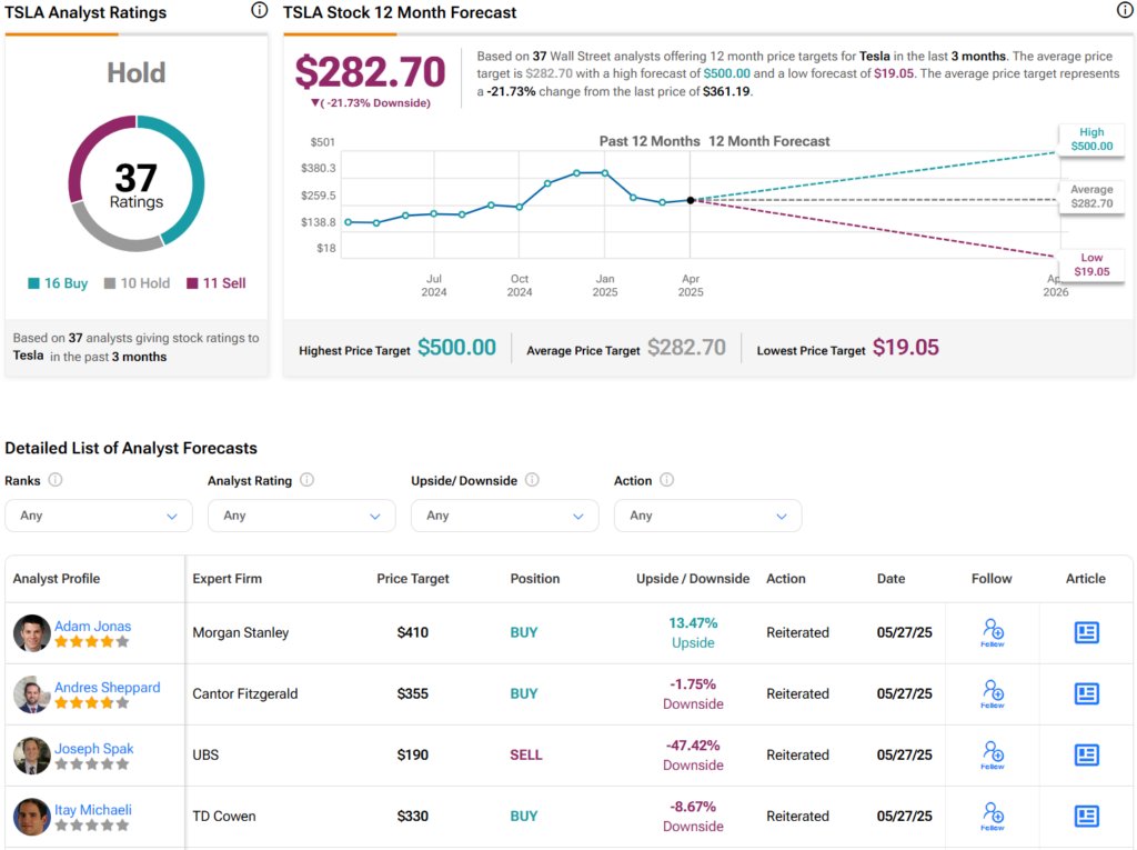When it comes to Elon Musk’s companies, most of them are privately held. However, retail investors can invest in his most popular company, Tesla. Turning to Wall Street, analysts have a Hold consensus rating on TSLA stock based on 16 Buys, 10 Holds, and 11 Sells assigned in the past three months, as indicated by the graphic below. Furthermore, the average TSLA price target of $282.70 per share implies 21.7% downside risk.