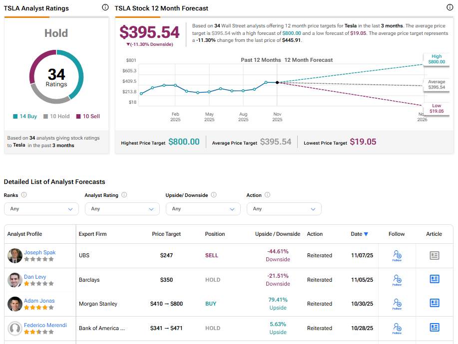 According to TipRanks, TSLA stock has received a Hold consensus rating, with 14 Buys, 10 Holds, and 10 Sells assigned in the last three months. The average Tesla stock price target is $395.54, suggesting a potential downside of 11.3% from the current level.