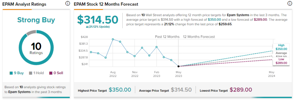 Analysts, however, are bullish about EPAM stock with a Strong Buy consensus rating based on nine Buys and one Hold.