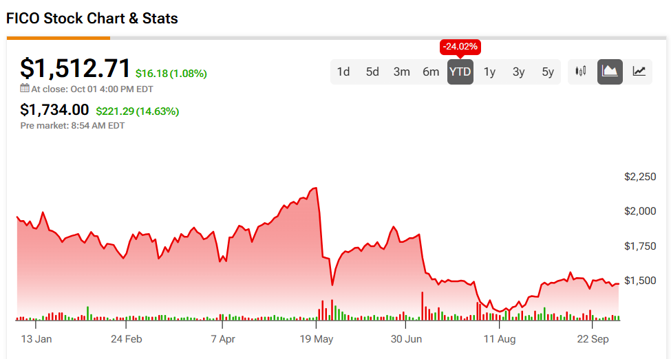 Fair Isaac stock was up 14.63% in pre-market trading on Thursday, following a 1.08% rally yesterday. The shares have fallen 24.02% year-to-date and declined 21.86% over the past 12 months. Despite today’s rally, trading volume is limited at roughly 69,000 shares, compared to a three-month daily average of about 295,000 units.