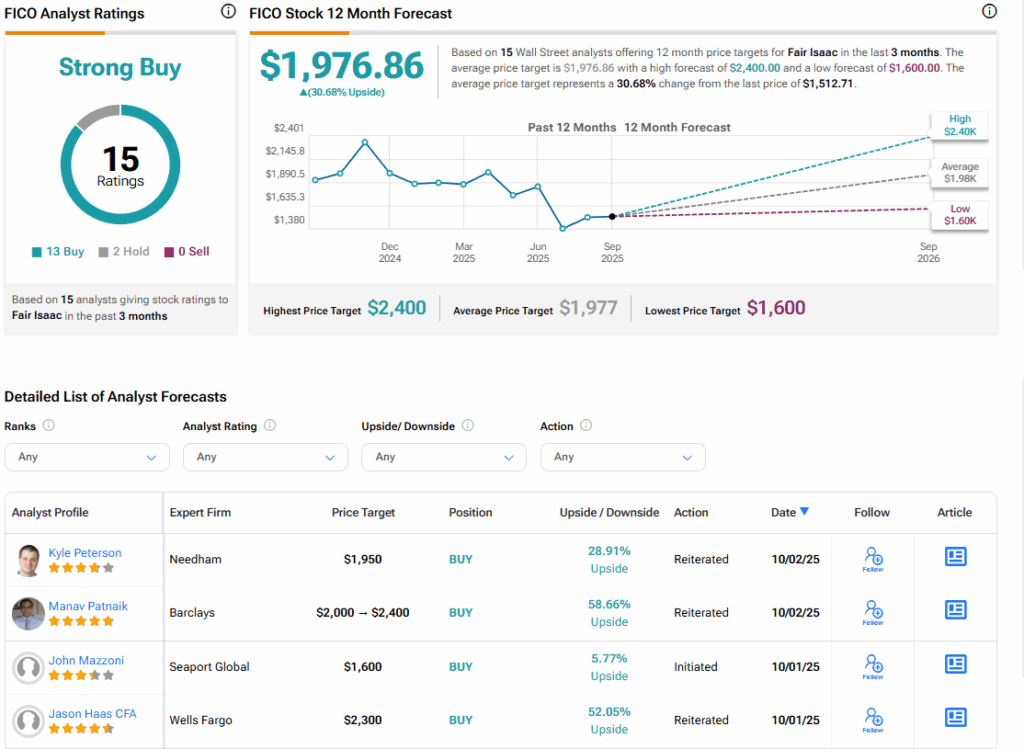 Turning to Wall Street, the analysts’ consensus rating for Fair Isaac is Strong Buy, based on 13 Buy and two Hold ratings over the past three months. With that comes an average FICO stock price target of $1,976.86, representing a potential 30.68% upside for the shares.