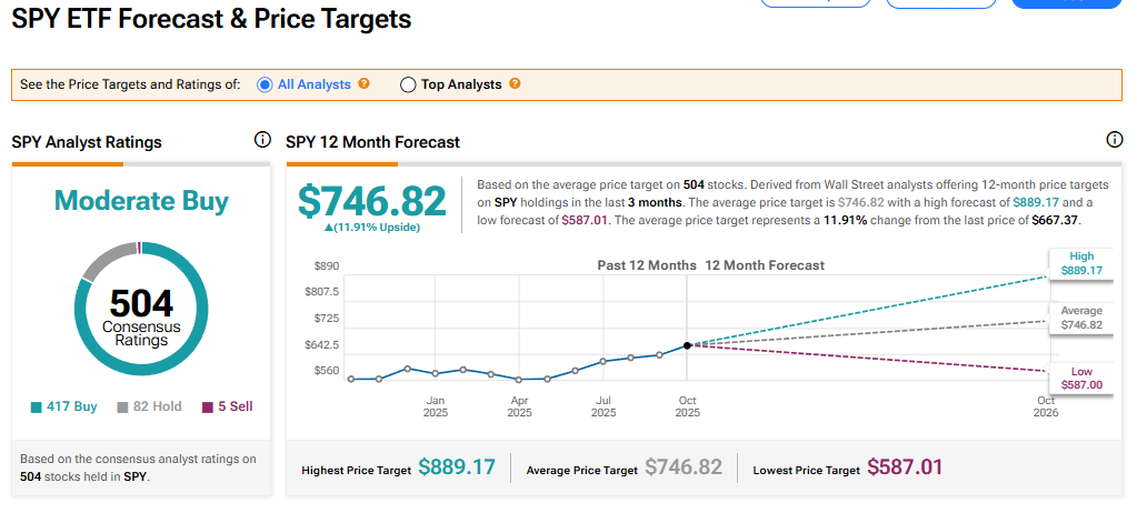 The SPDR S&P 500 ETF Trust (SPY) currently has a Moderate Buy rating among 504 Wall Street analysts. That rating is based on 417 Buy, 82 Hold, and five Sell recommendations issued in the last three months. The average SPY price target of $746.82 implies 11.91% upside from current levels.