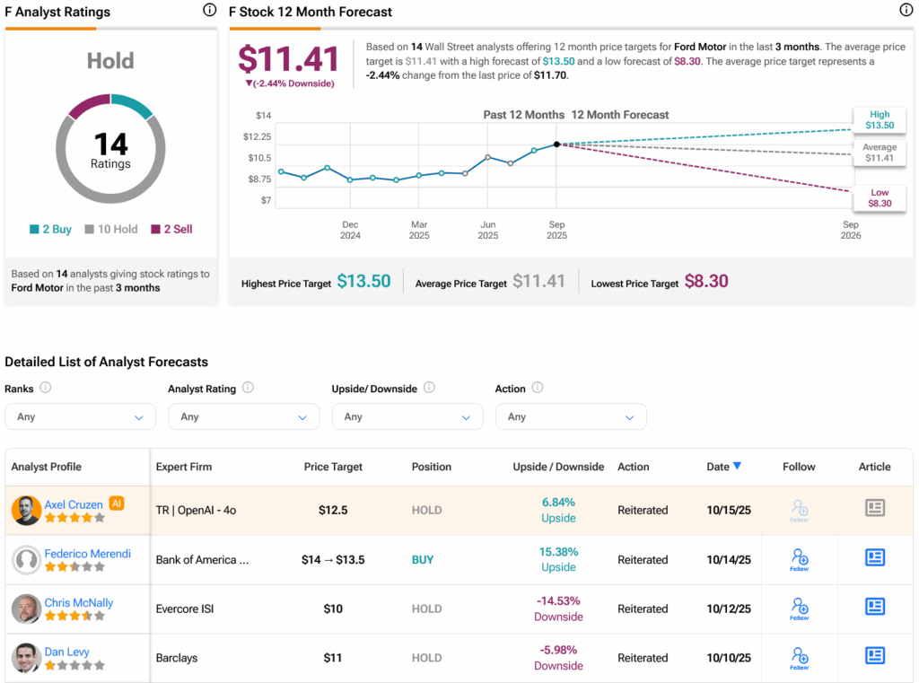 Turning to Wall Street, analysts have a Hold consensus rating on F stock based on two Buys, 10 Holds and two Sells assigned in the past three months, as indicated by the graphic below. After a 6.23% rally in its share price over the past year, the average F price target of $11.41 per share implies 2.44% downside risk.