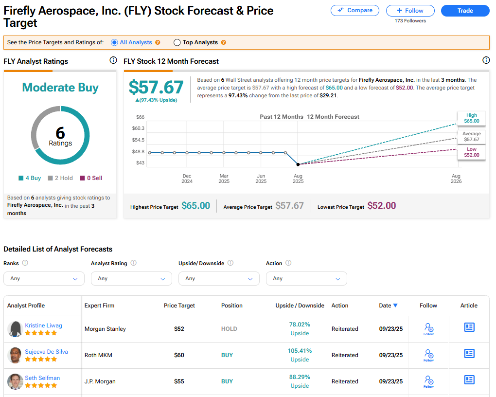 The stock of Firefly Aerospace has a consensus Moderate Buy rating among six Wall Street analysts. That rating is based on four Buy and two Hold recommendations issued in the last three months. The average FLY price target of $57.67 implies 97.43% upside from current levels.
