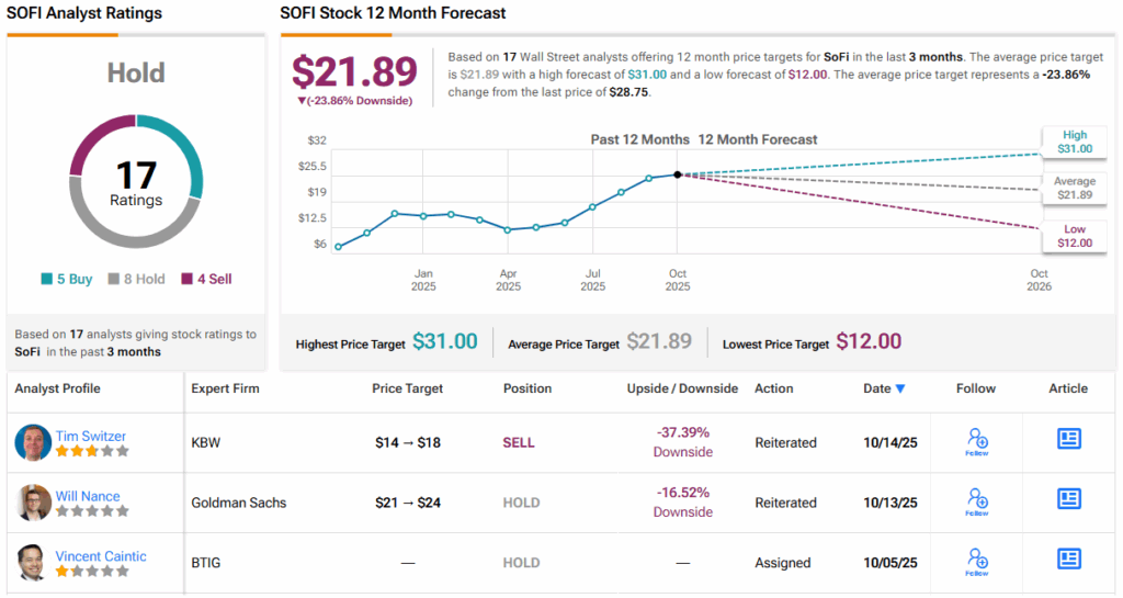 Wall Street isn’t quite as enthusiastic. With 5 Buys, 8 Holds, and 4 Sells, SOFI carries a consensus Hold (i.e. Neutral) rating. Its 12-month average price target of $21.89 implies losses of ~24%. (See SOFI stock forecast)