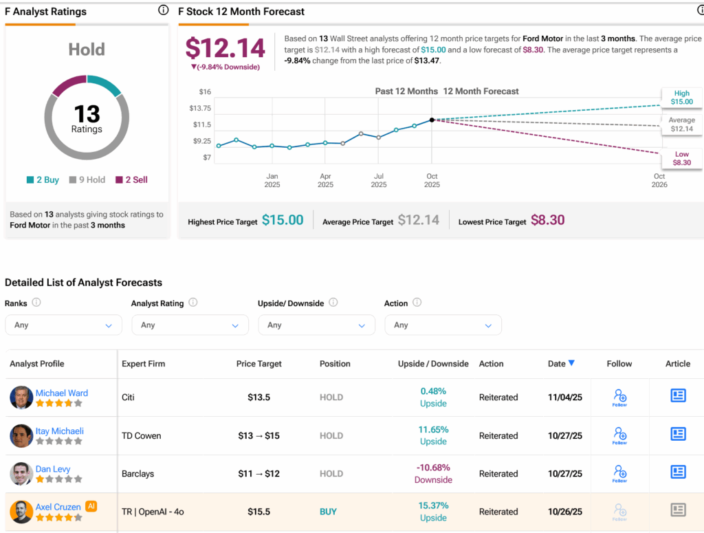 Turning to Wall Street, analysts have a Hold consensus rating on F stock based on two Buys, nine Holds and two Sells assigned in the past three months, as indicated by the graphic below. After an 19.82% rally in its share price over the past year, the average F price target of $12.14 per share implies 9.84% downside risk.