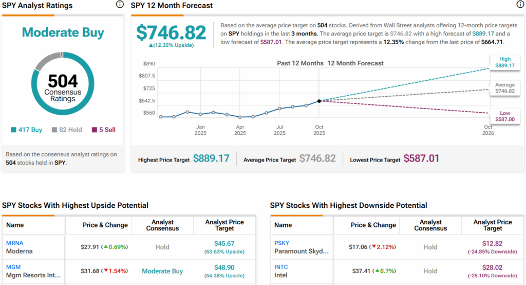 Turning to Wall Street, analysts have a Moderate Buy consensus rating on SPY stock based on 417 Buys, 82 Holds, and five Sells assigned in the past three months, as indicated by the graphic below. Furthermore, the average SPY price target of $746.82 per share implies 12.4% upside potential.