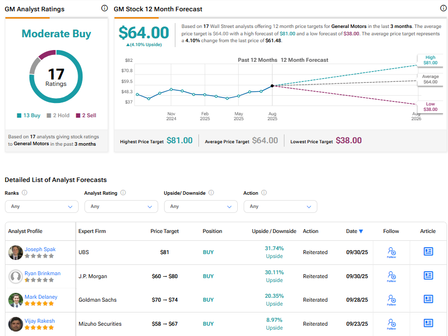 Overall, GM stock has a Moderate Buy consensus rating based on 13 Buy, two Hold, and two Sell recommendations. The average General Motors stock price target is $64, implying a 4.09% upside potential from current levels.