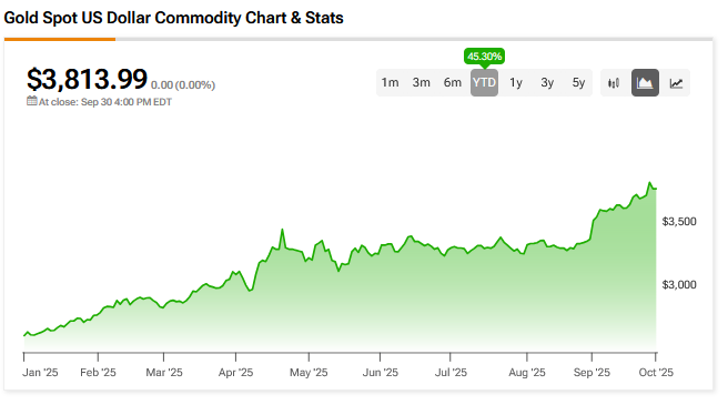 The U.S. government shutdown also drove investors to the safe haven of gold today, helping the spot price climb at one point to $3,875. That’s just $20 shy of the record peak it reached earlier this week.