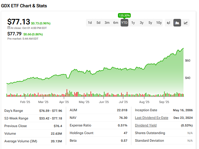 The SPDR Gold Shares ETF (GLD) is up 46% so far this year with the VanEck Gold Miners ETF (GDX) up 125.30%.