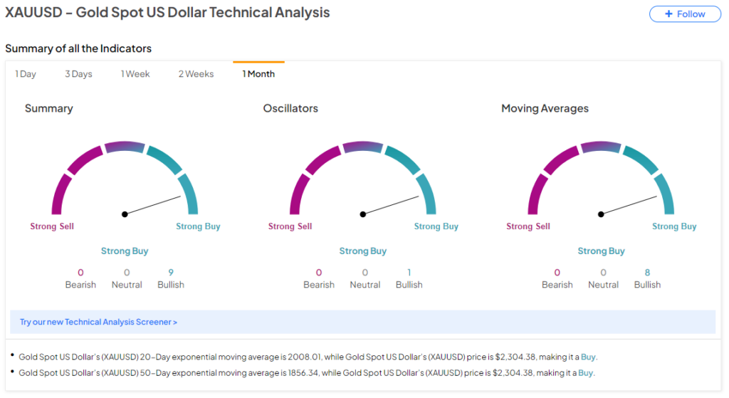 Importantly, while gold has been under pressure over the past few sessions, the TipRanks Technical Analysis tool too is flashing a Strong Buy signal for gold on a monthly timeframe. This indicates that investors could utilize further weakness in gold as a buying opportunity for the long term.