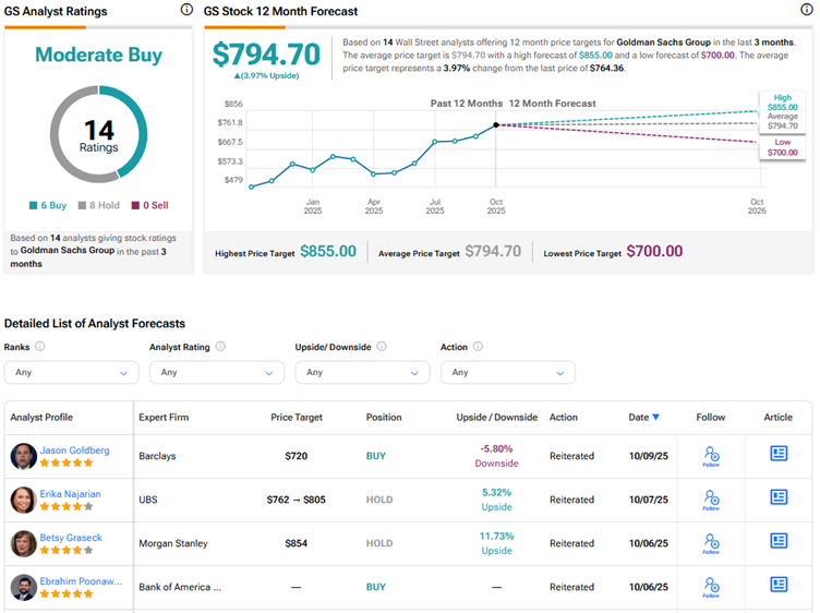 Overall, Wall Street has a Moderate Buy consensus rating on Goldman Sachs stock based on six Buys and eight Holds. The average GS stock price target of $794.70 indicates a 4% upside potential from current levels.