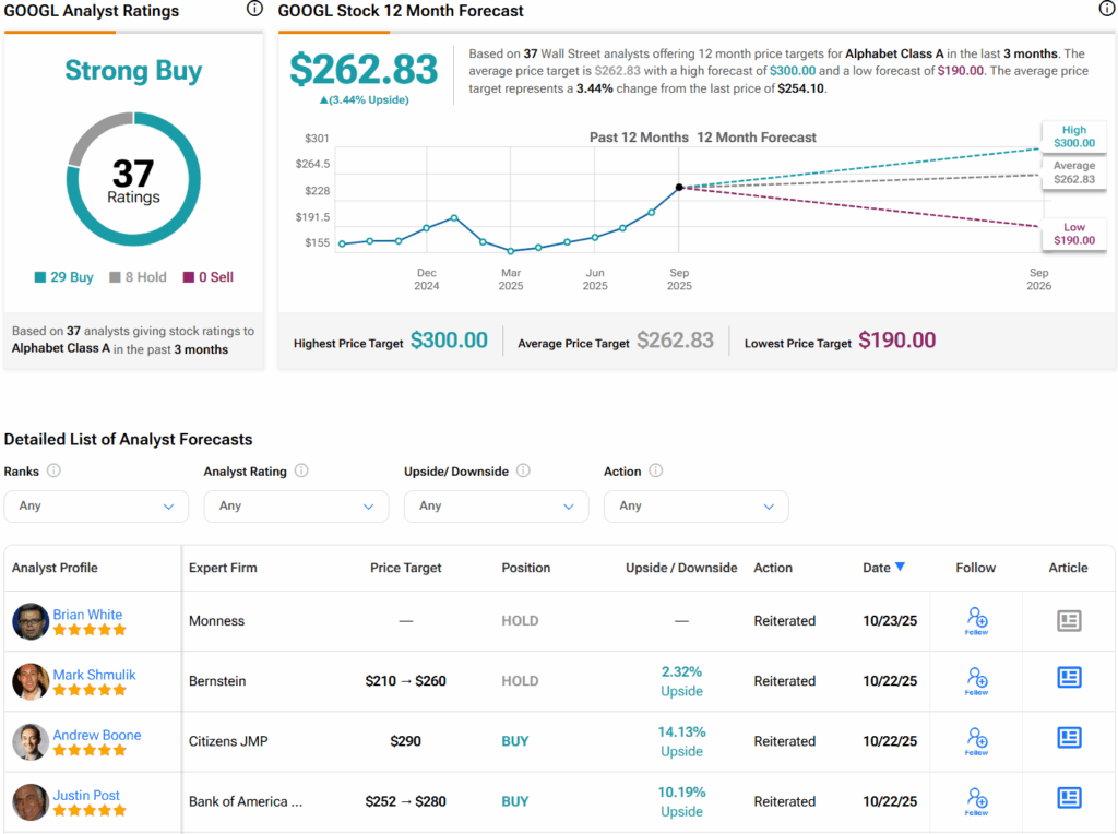 Turning to Wall Street, analysts have a Strong Buy consensus rating on GOOGL stock based on 29 Buys and eight Holds assigned in the past three months. Furthermore, the average GOOGL price target of $262.83 implies that shares are trading near fair value.