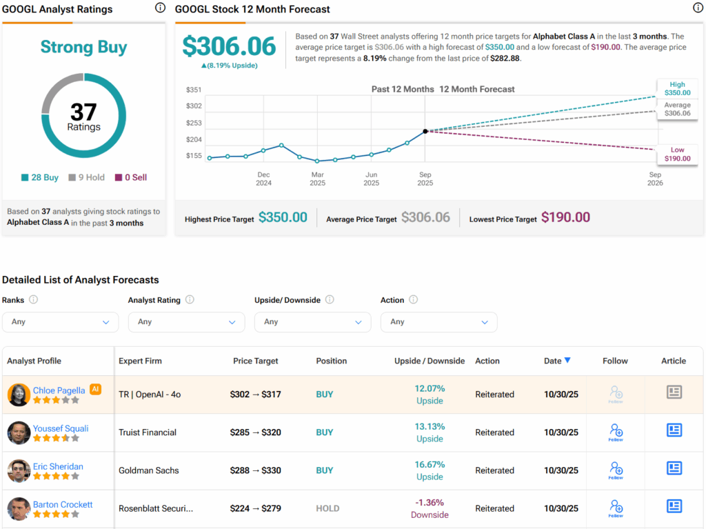 Turning to Wall Street, analysts have a Strong Buy consensus rating on GOOGL stock based on 28 Buys and nine Holds assigned in the past three months. Furthermore, the average GOOGL price target of $306.06 per share implies 8.2% upside potential.