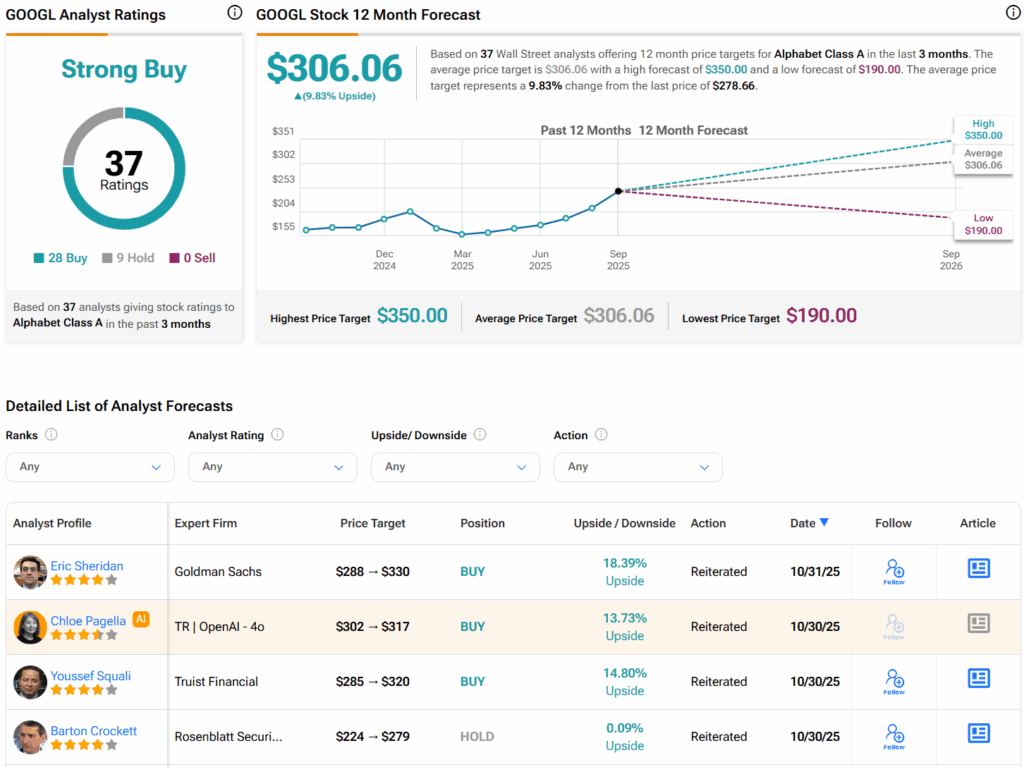 Turning to Wall Street, analysts have a Strong Buy consensus rating on GOOGL stock based on 28 Buys and nine Holds assigned in the past three months. Furthermore, the average GOOGL price target of $306.06 per share implies 8.2% upside potential.