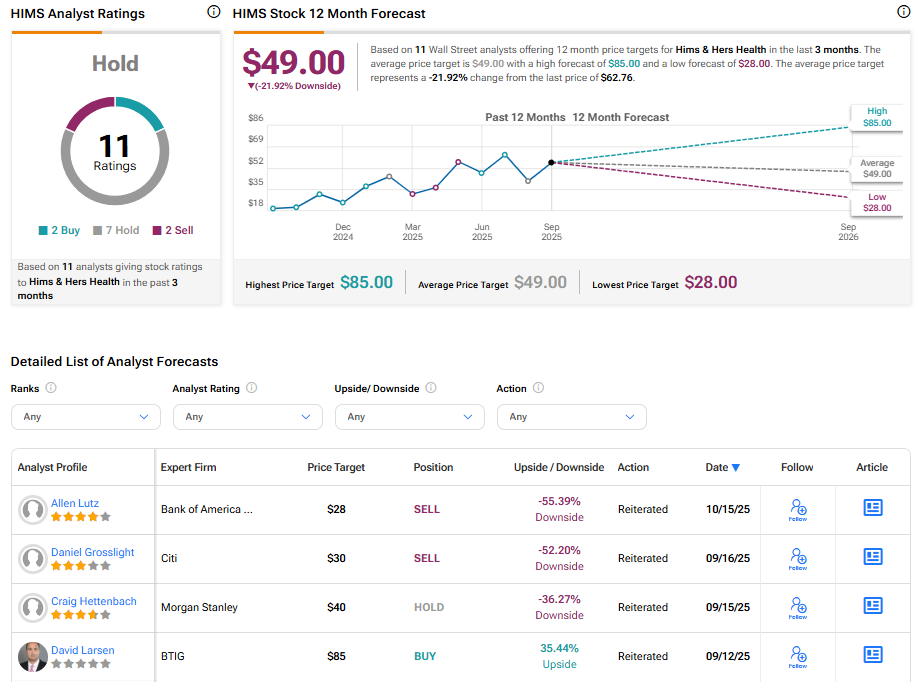 Turning to Wall Street, HIMS stock has a Hold consensus rating based on two Buys, seven Holds, and two Sells assigned in the last three months. At $49.00, the average Hims & Hers stock price target implies a 21.92% downside risk.