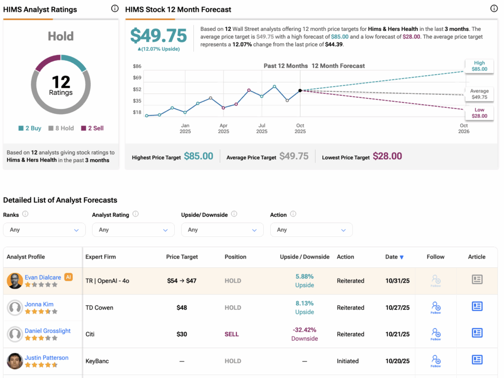 Overall, Wall Street analysts have a Hold consensus rating on HIMS stock based on two Buys, eight Holds, and two Sells assigned in the last three months. The average HIMS stock price target of $49.75 implies an upside of 12% from the current trading level.