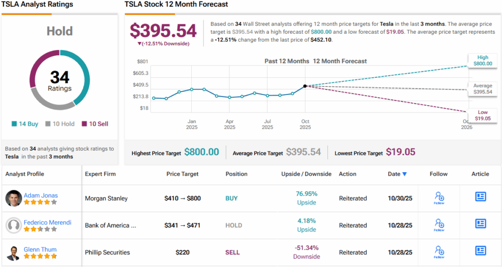 So, that’s Bank of America’s view, but what does the rest of the Street make of TSLA’s prospects? The ratings break down into 14 Buys, 10 Holds, and 10 Sells, resulting in a Hold (i.e., Neutral) consensus. Based on the $395.54 average price target, TSLA shares are expected to change hands at a ~12.5% discount a year from now. (See TSLA stock forecast)