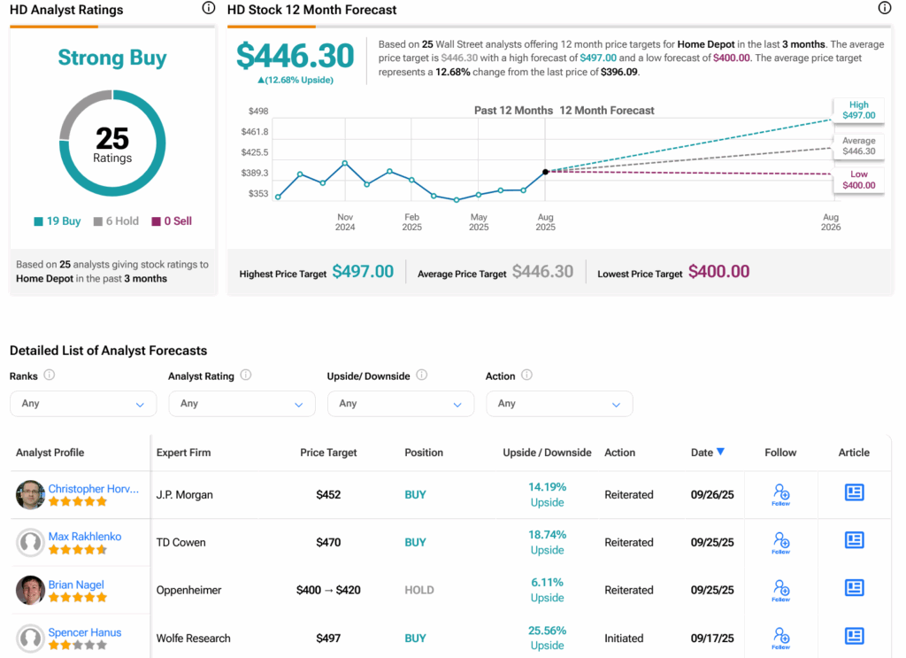 Turning to Wall Street, analysts have a Strong Buy consensus rating on HD stock based on 19 Buys and six Holds assigned in the past three months, as indicated by the graphic below. After a 3.27% loss in its share price over the past year, the average HD price target of $446.30 per share implies 12.68% upside potential.