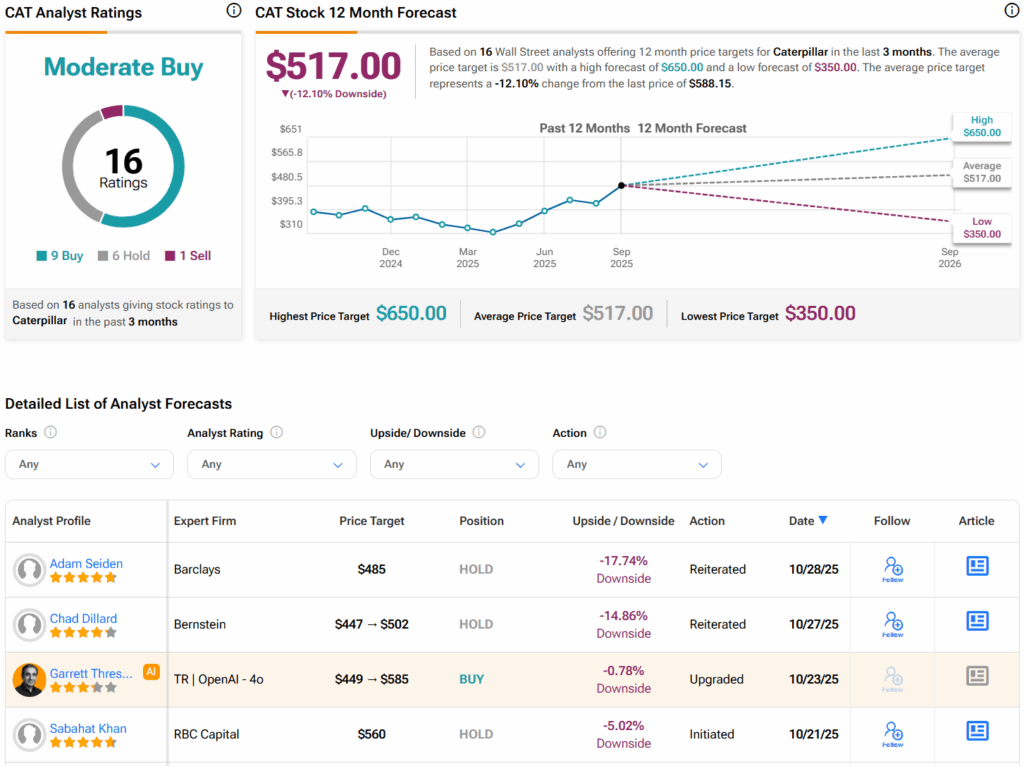 Turning to Wall Street, analysts have a Moderate Buy consensus rating on CAT stock based on nine Buys, six Holds, and one Sell assigned in the past three months, as indicated by the graphic below. Furthermore, the average CAT price target of $517 per share implies 12.1% downside risk.