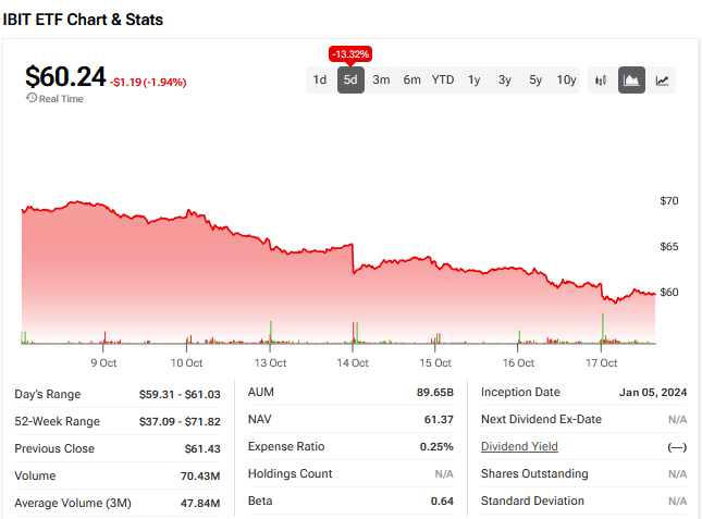 How is IBIT stock faring? The iShares Bitcoin Trust (IBIT) had another difficult day. It is now down 13.32% over the past 5 days, but remains 15.80% higher in the year-to-date.