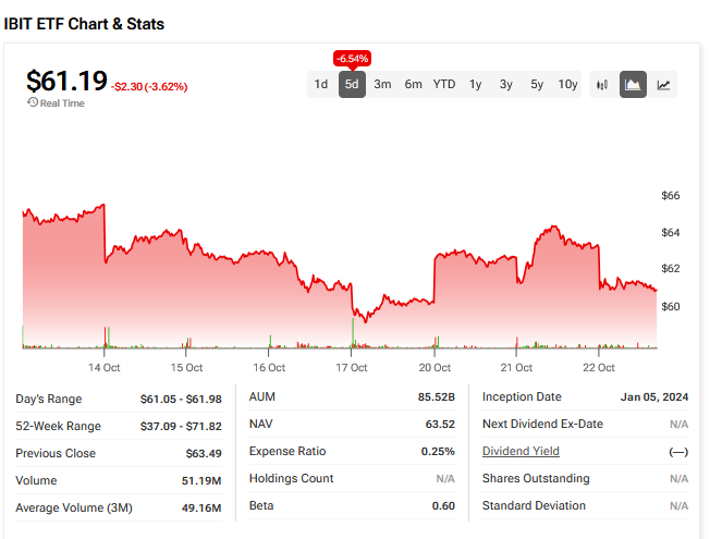 How is IBIT stock faring? The iShares Bitcoin Trust (IBIT) was down again today after a short-lived recovery yesterday. It is now down 6.54% over the past 5 days, but remains 19.68% higher in the year-to-date.
