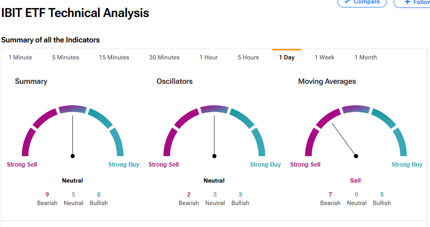 According to TipRanks technical analysis, the IBIT is now at a Neutral consensus based on 9 Bearish, 5 Neutral and 8 Bullish ratings.