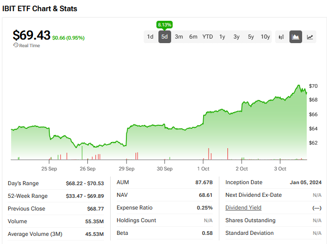How is IBIT stock faring? The iShares Bitcoin Trust (IBIT) is up 8.13% over the past five days and has gained about 29.63% year-to-date.
