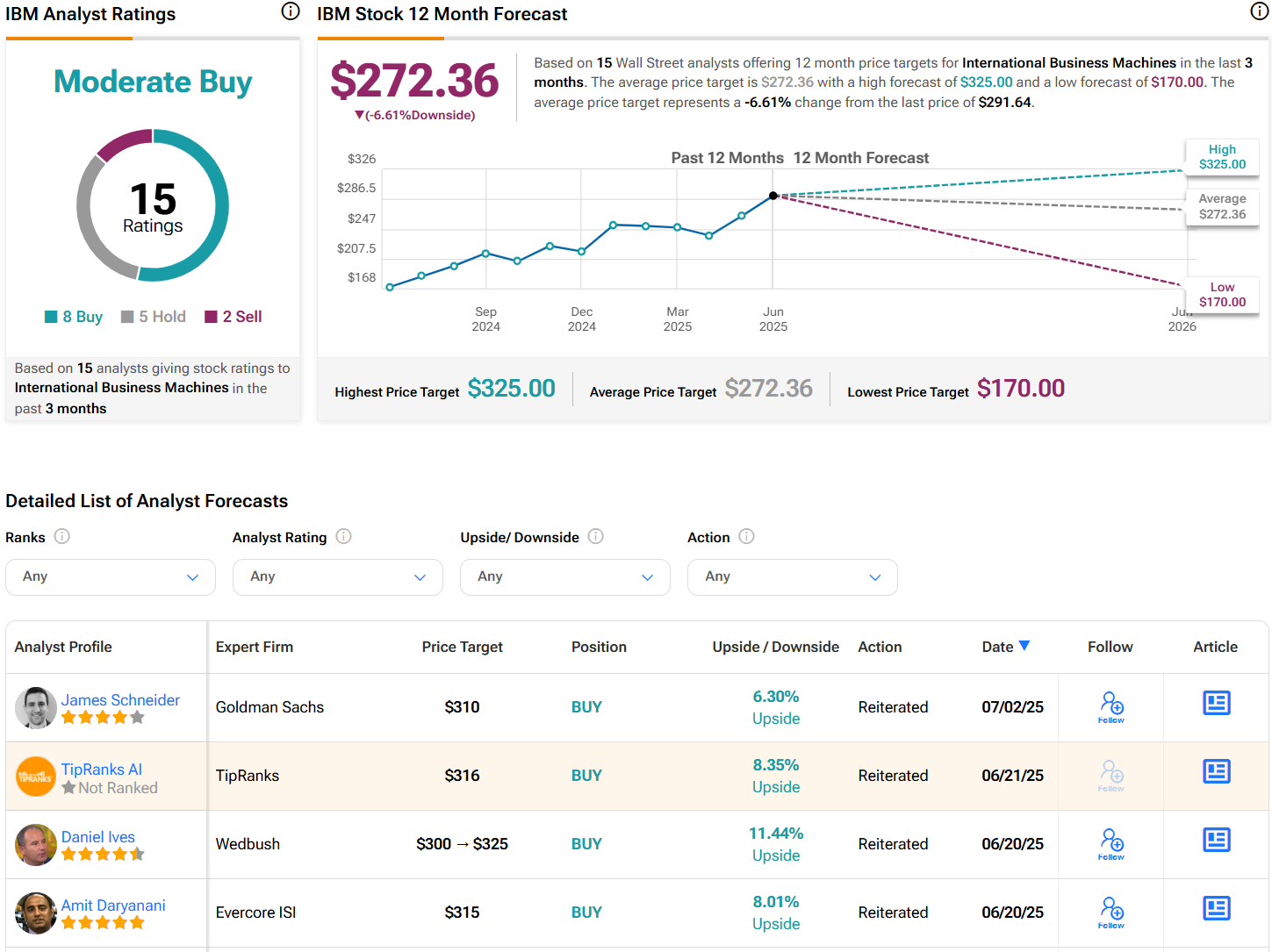 Turning to Wall Street, analysts have a Moderate Buy consensus rating on IBM stock based on eight Buys, five Holds, and two Sells assigned in the past three months, as indicated by the graphic below. Furthermore, the average IBM price target of $272.36 per share implies 6.6% downside risk.